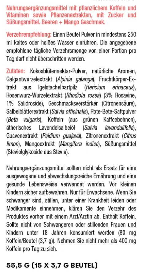 Es enthält Kräuter wie Rhodiola und Igelstachelbartpilz sowie wissenschaftlich nachgewiesene Inhaltsstoffe wie natürliches Koffein und pflanzliche B-Vitamine, die verschiedene Aspekte des Wohlbefindens des Gehirns unterstützen und auch für mentale Energie¹ , Klarheit² und Konzentration³ sorgen.