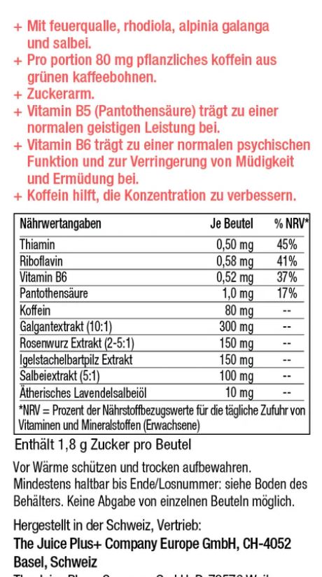 Unterstützt die mentale Energie durch die Aufnahme von Pantothensäure (Vitamin B5) aus Fruchtextrakten, die zu einer normalen geistigen Leistung beiträgt.