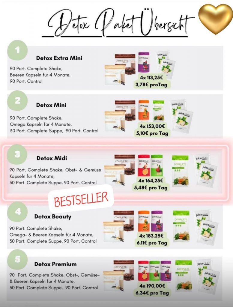 Bevor Sie für sich selbst eine Detox-Runde machen oder an einer solchen Detox-Runde in einer Whats App Gruppe mit merheren Menschen zusammen teilnehmen, ist es wichtig, daß Sie mindestens ein Kapselprodukt und ein Shake-Produkt haben, damit Sie auch wirklich richtige gute Ergebnisse erzielen.
